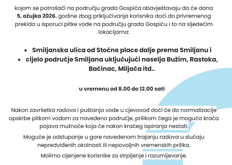 Obavijest korisnicima vodoopskrbnog sustava Grada Gospića