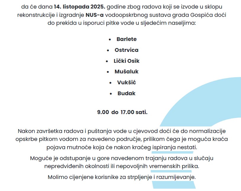 Obavijest korisnicima vodoopskrbnog sustava Grada Gospića i Općine Perušić