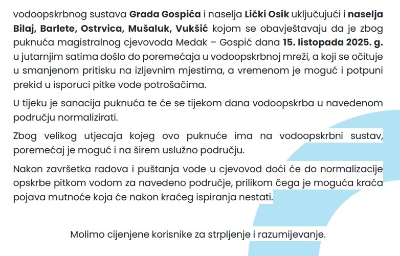 Obavijest korisnicima vodoopskrbnog sustava Grada Gospića i Općine Perušić