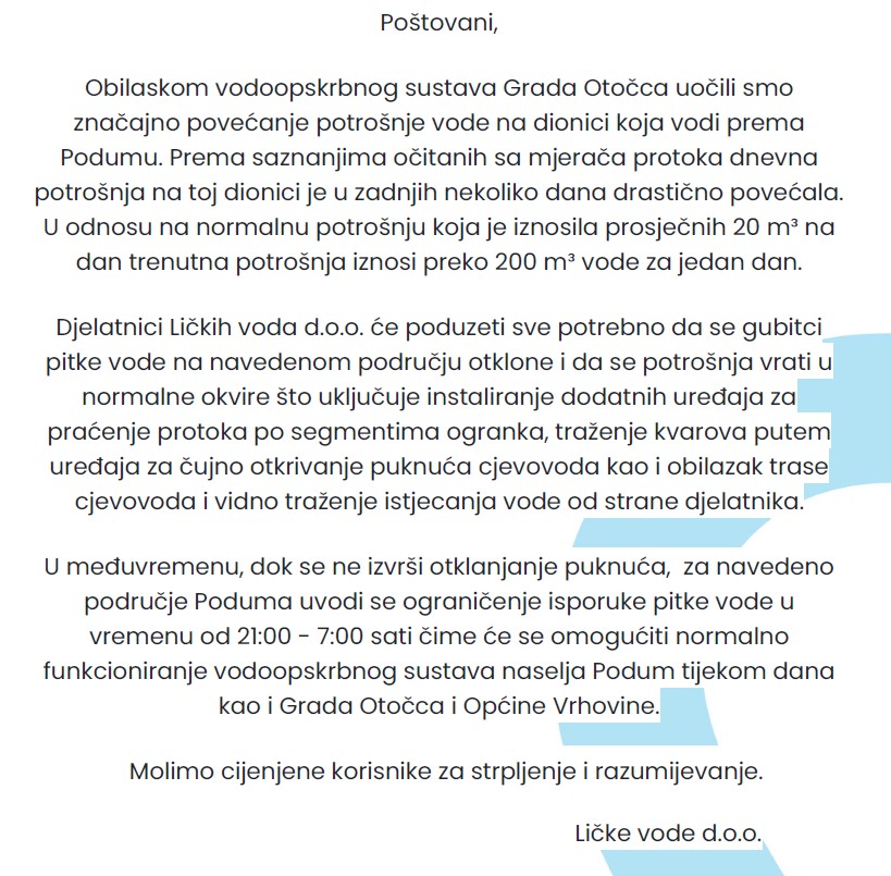 Obavijest korisnicima vodoopskrbnog sustava Grada Otočca (Naselje Podum)