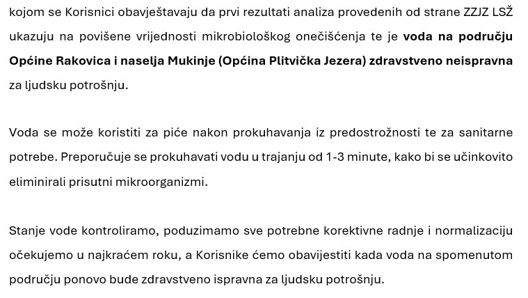 Obavijest korisnicima vodoopskrbnog sustava Općina Rakovica i Plitvička Jezera